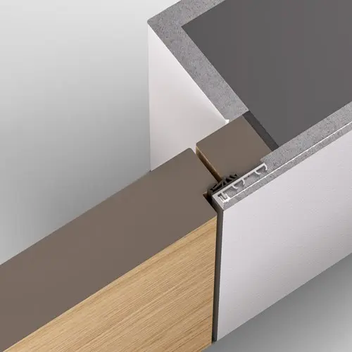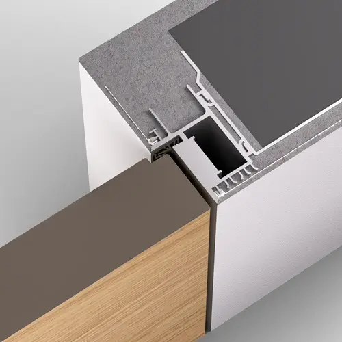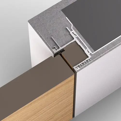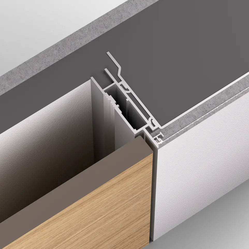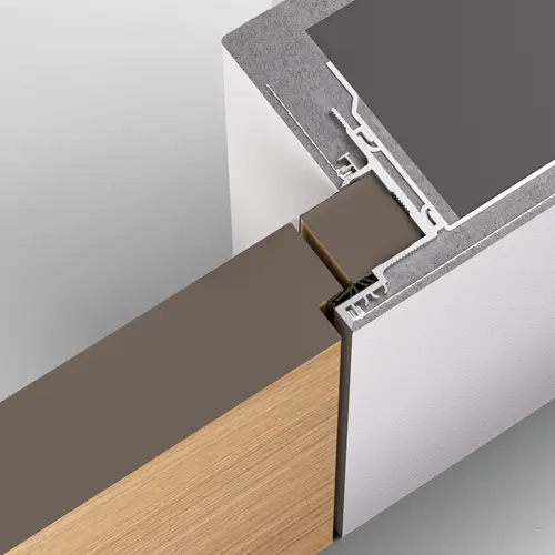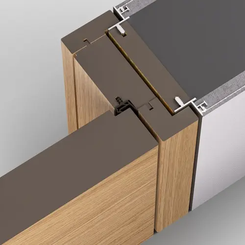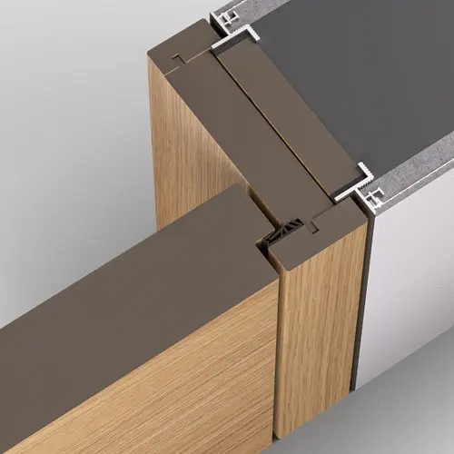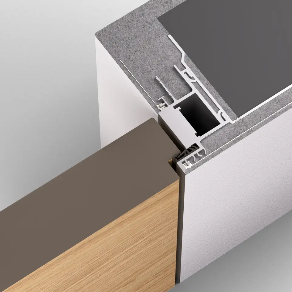 La transition critique entre le cadre de porte et la maçonnerie est résolue grâce au treillis de plâtre clipsable, garantissant une connexion ferme et directe. Cette solution brevetée crée des lignes parfaitement droites sans cadre visible ni joint acrylique.